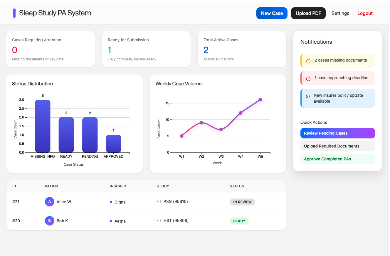We understand the frustration of slow approvals, endless paperwork, and denied claims. That’s why we’ve built AI-powered tools and smart workflows specifically for sleep medicine practices to automate forms, reduce errors, and speed up approvals. Our goal is to save your team time, protect revenue, and make prior authorizations virtually effortless.